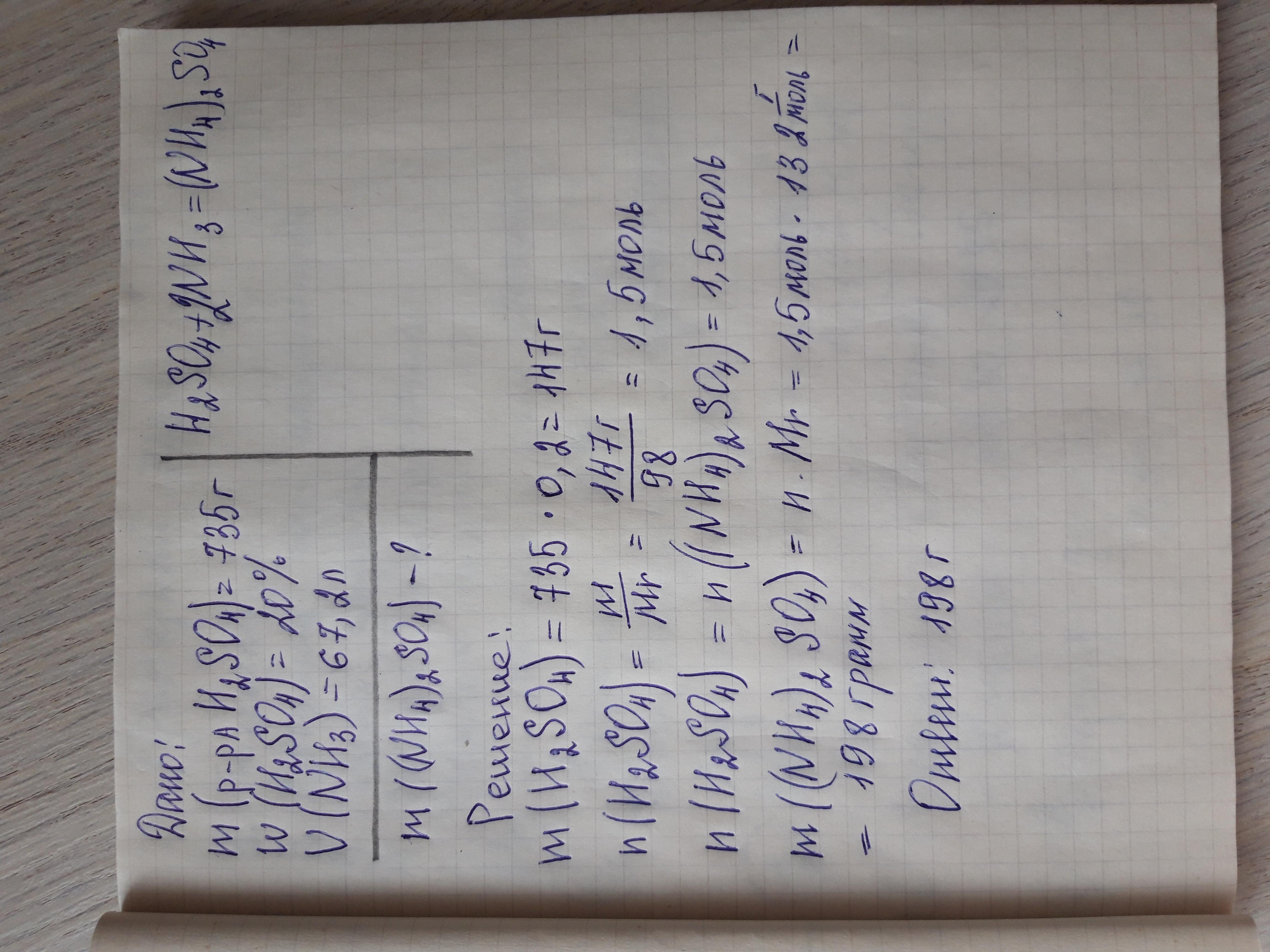 В 735 г 20% раствора серной кислоты растворили 67,2 л аммиака(н.у.). Рассчитайте массу образовавшейся соли. Можно написать с Дано, Найти и само решение?