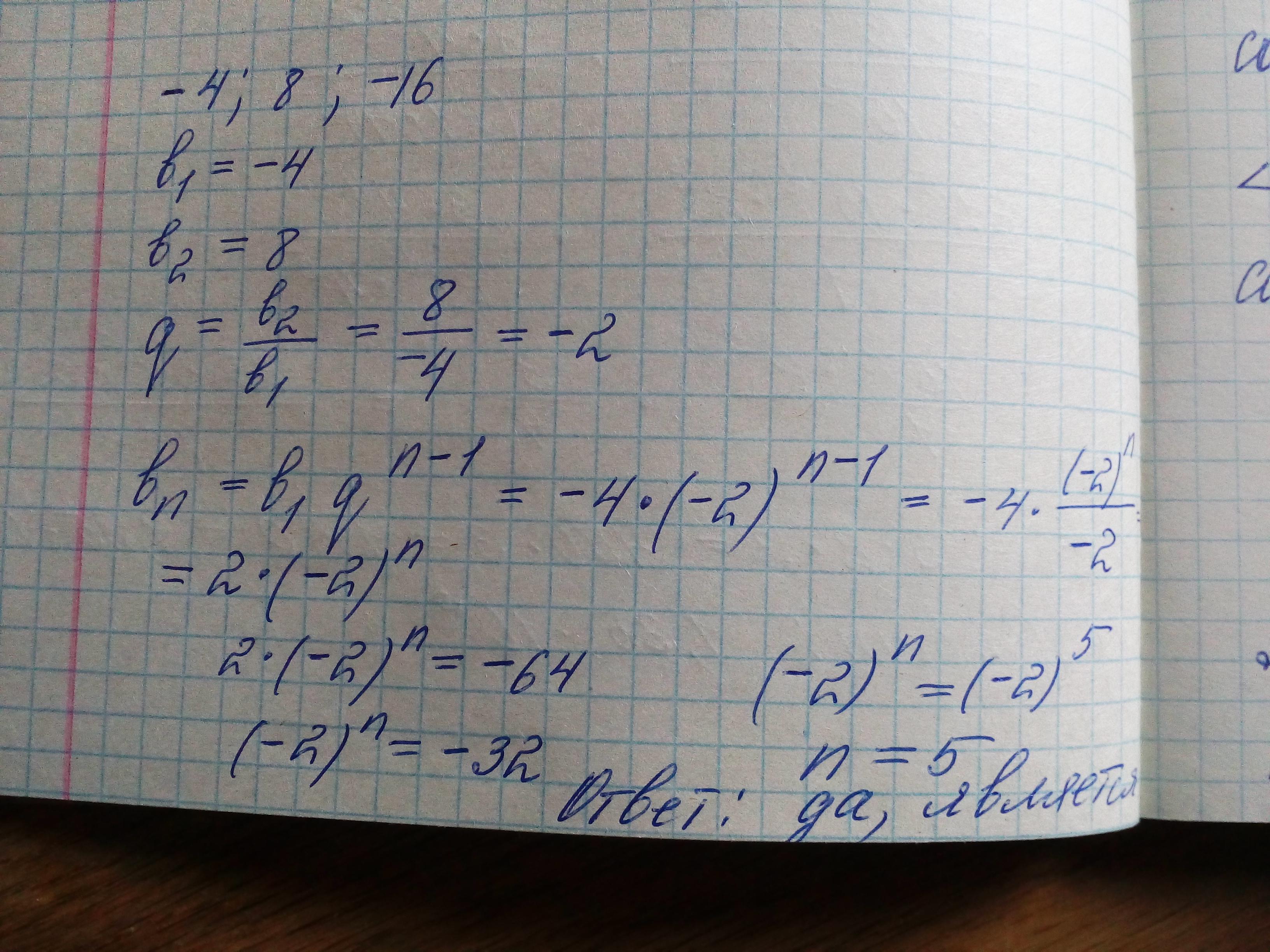 Геометрическая прогрессия задана (хn): -4;8;-16.... Является ли число -64 членом геометрической прогрессии?