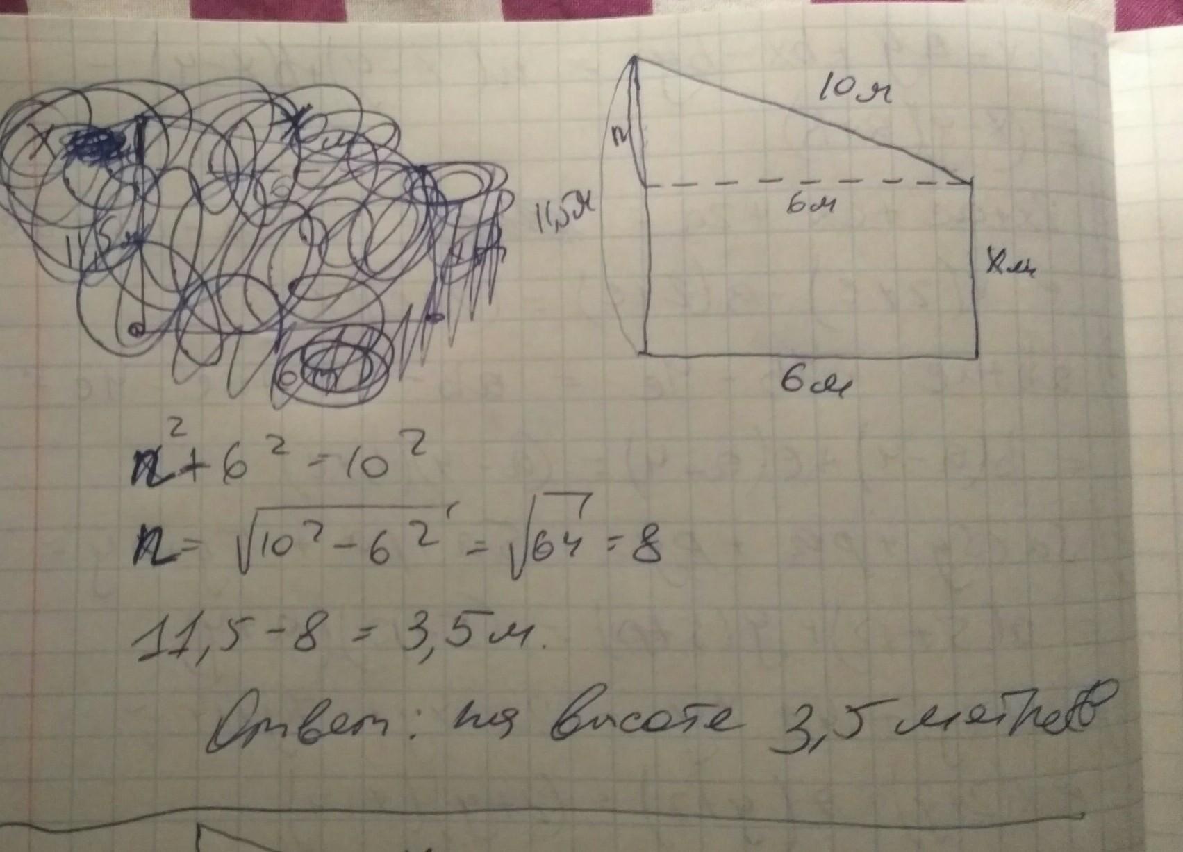 От столба высотой 11,5 м к дому натянут провод длиной 10 м который крепится к стене. расстояние от дома до столба равно 6 м. на какой высоте провод крепится к стене? ответ дайте в метрах.