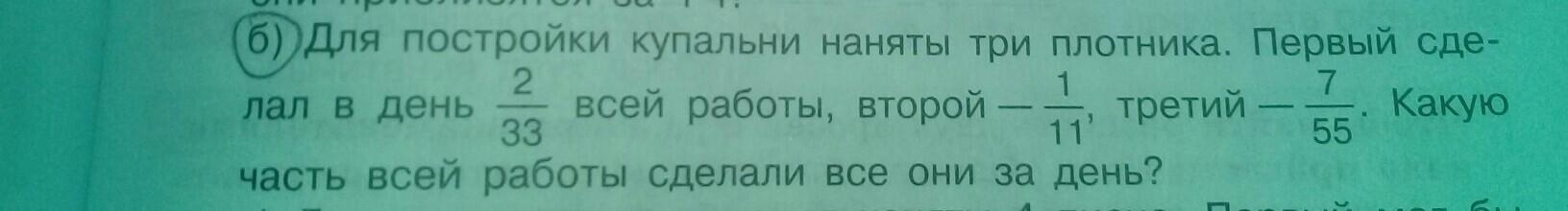 для постройки купальни наняты три плотника . Первый сделал в день 2 / 33 всей работы , второй - 1 / 11 , третий - 7 / 55. Какую часть всей работы сделали все они за день? помагите пожалуйста.