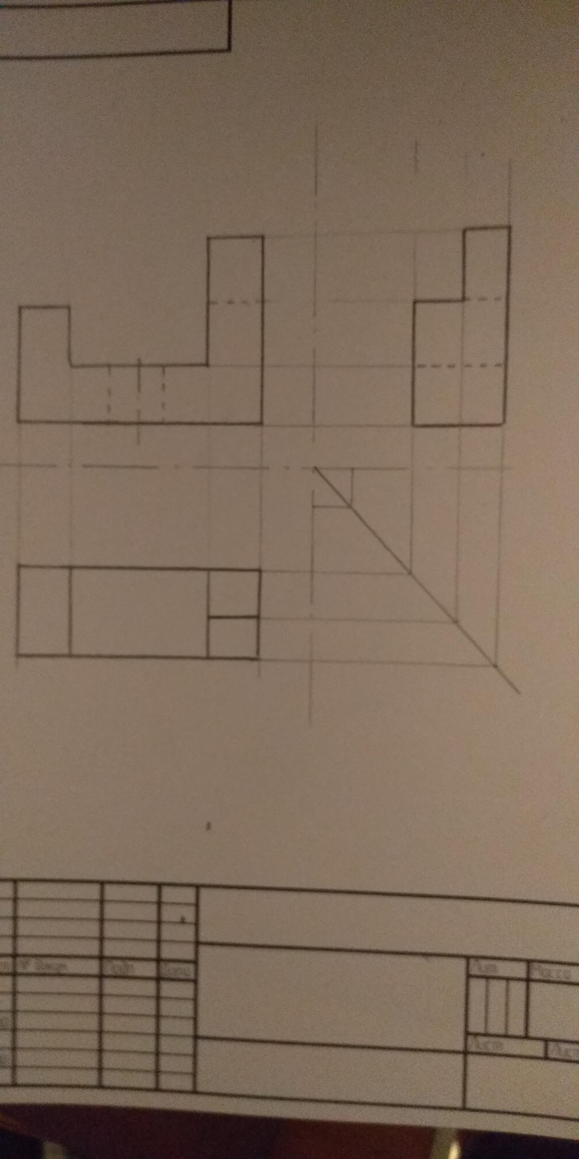 Сначала проведи оси симметрии ("крест" через весь лист, как у меня), затем отмерь примерно по 1 см справа и снизу и начерти квадрат, справа от нижней проекции и проведи к углу прямую. Затем отпроектируй стороны нижнего вида направо и от этого - вверх. Потом проектируй уже основной вид на правую сторону. В итоге должен получиться примерно такой чертеж: