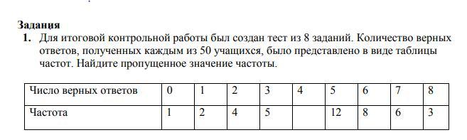 Задания 1. Для итоговой контрольной работы был создан тест из 8 заданий. Количество верных ответов, полученных каждым из 50 учащихся, было представлено в виде таблицы частот. Найдите пропущенное значение частоты. Число верных ответов 0 1 2 3 4 5 6 7 8 Частота 1 2 4 5 ... 12 8 6 3