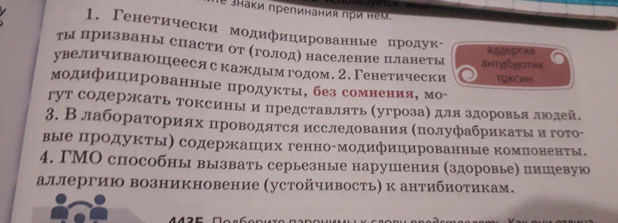 Ответ: 1. Генетически модифицированные продукты призваны спасти от *голода*- (родительный падеж) население планеты увеличивающееся с каждым годом . 2 Генетически модифиц . продукты , без сомнения , могут содержать токсины и представлять * угрозу * - (Именительный падеж) для здоровья людей . 3 В лабораториях проводятся исследования *полуфабри к а т о в и готовых продук. * - (Род. Падеж) содержащих генно-модифицированные компоненты . 4 ГМО способны вызвать серьёзные нарушения * здоровья * - (род падеж) пищевую аллергию возникновение *устойчивости* - (род. Падеж ) к антибиотикам