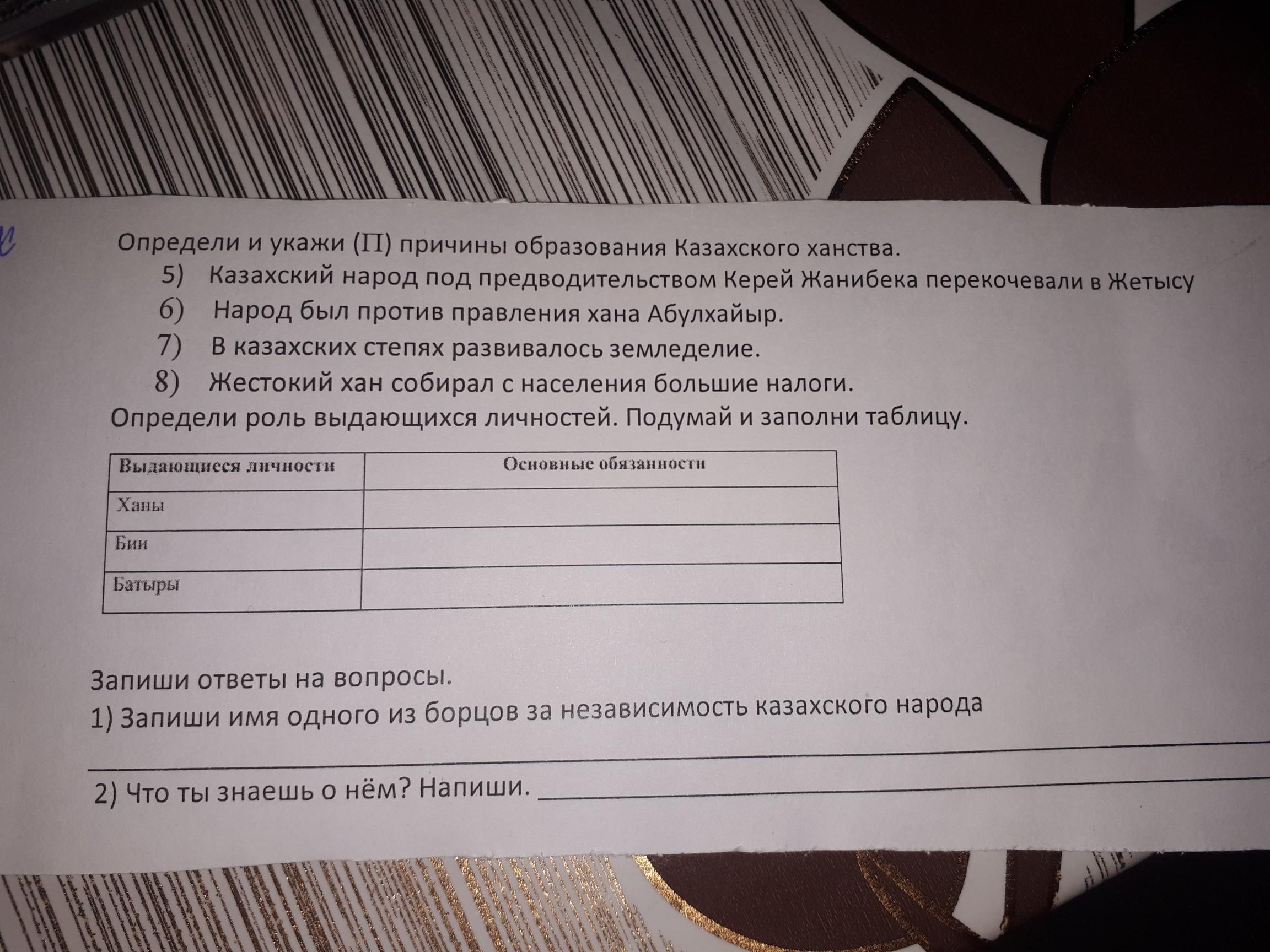 ответ на первый вопрос 5 7 8 на второй ханы управляли ханством (государством) батыры были как бы главными воинами сори про биев не знаю помог как могу