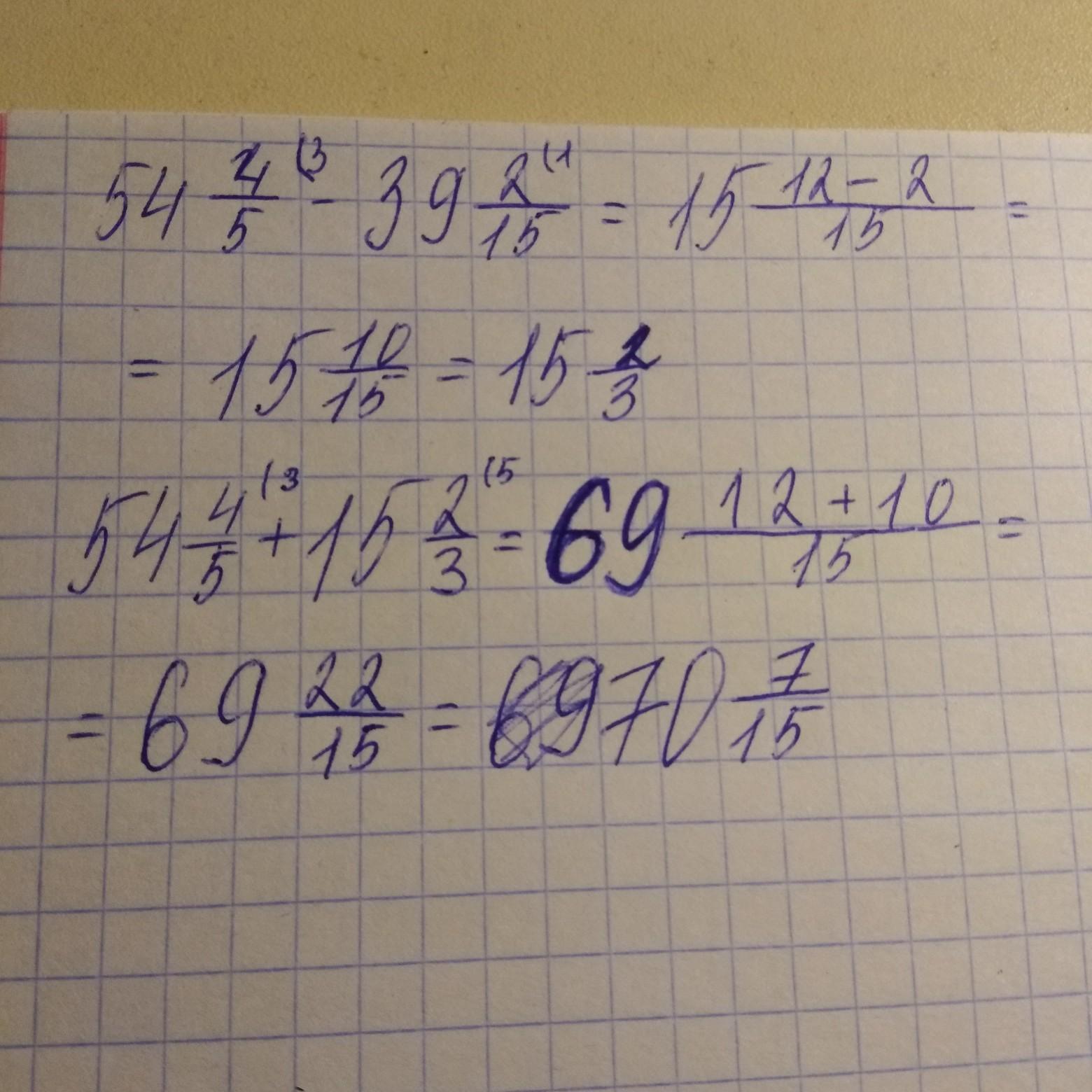 первое число равно 54 целых 4/5,второе число на 39 целых 2/15 меньше первого числа. найдите значение суммы двух чисел