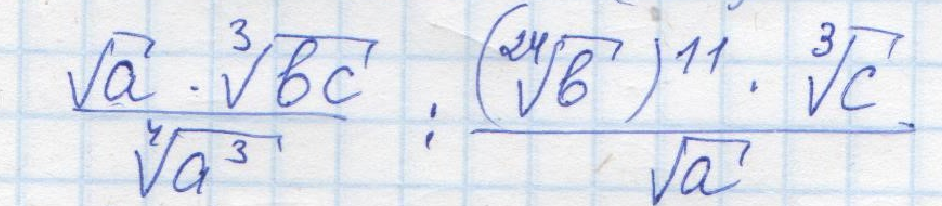 frac{a^{1/2}b^{1/3}c^{1/3}}{a^{3/4}}* frac{a^{1/2}}{b^{11/24}c^{1/3}}= frac{ab^{1/3}}{a^{3/4}b^{11/24}}=a^{1-3/4}b^{1/3-11/24}=a^{1/4}b^{-1/8}= frac{ sqrt[4]{a} }{ sqrt[8]{b} }