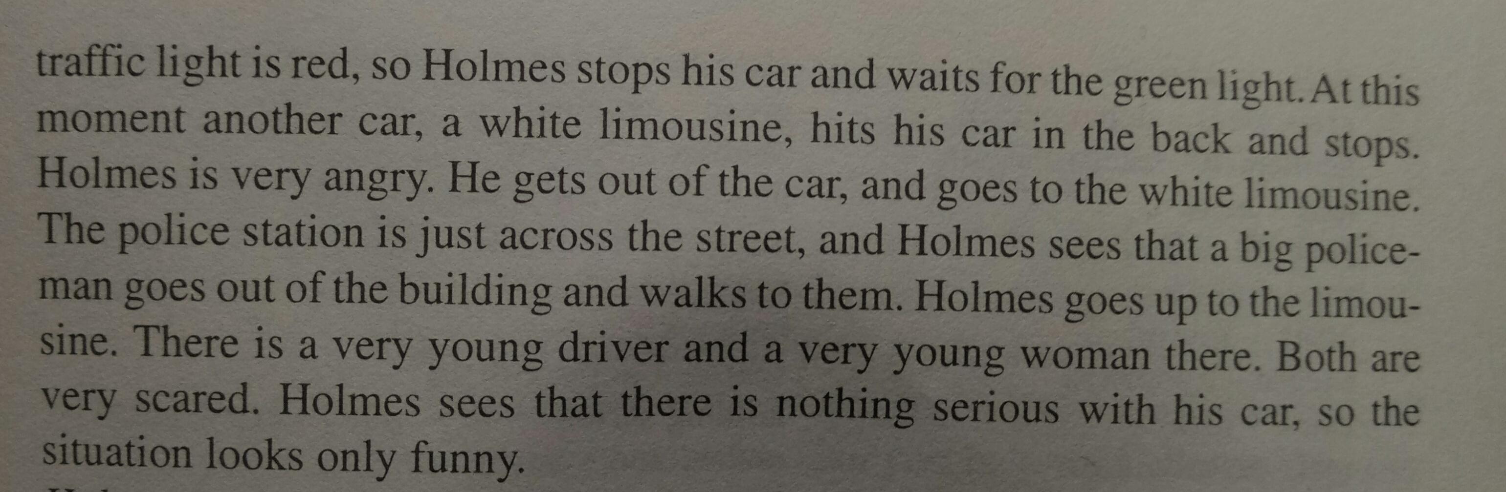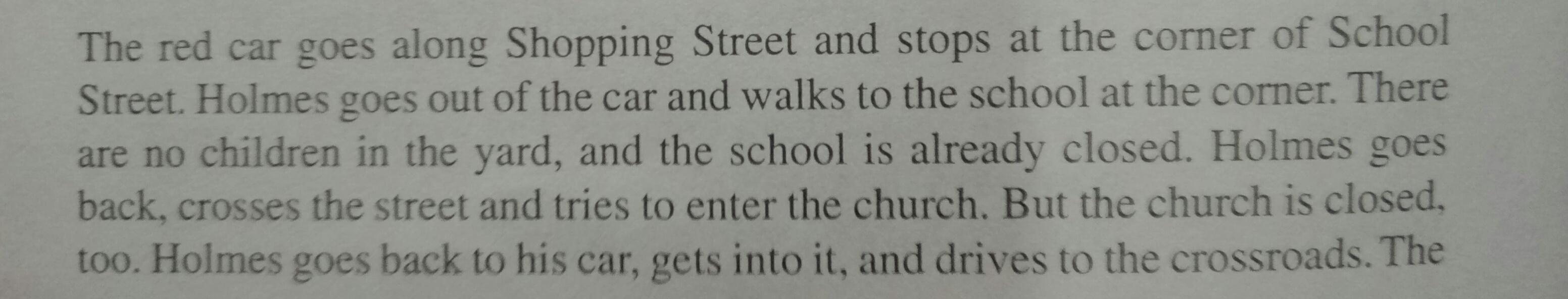 Красная машина проезжает вдоль улицы шоппинг и останавливается на углу улицы Школьная. Холмс выходит из машины и идёт к школе на углу. Детей во дворе нет, и школа уже закрыта.Холмс возвращается обратно, пересекает улицу и пытается войти в церковь. Но церковь закрыта тоже. Холмс возвращается обратно в свою машину, заходит в неё и едет на перекрёсток.