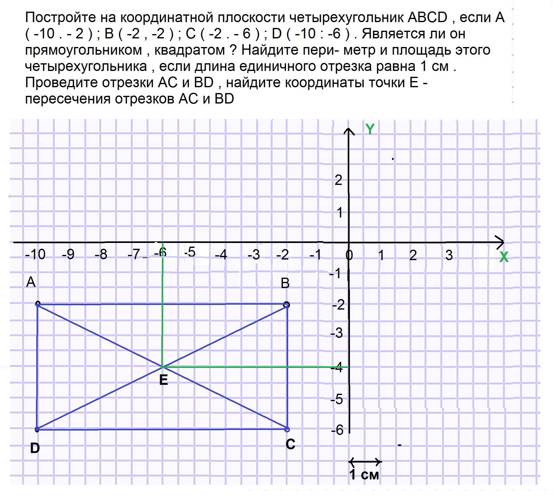 Постройте на координатной плоскости четырехугольник ABCD , если A ( -10 . - 2 ) ; B ( -2 , -2 ) ; C ( -2 . - 6 ) ; D ( -10 : -6 ) . Является ли он прямоугольником , квадратом ? Найдите пери- метр и площадь этого четырехугольника , если длина единичного отрезка равна 1 см . Проведите отрезки АС и BD , найдите координаты точки Е - пересечения отрезков АС и BD