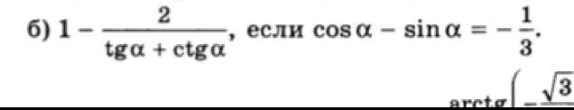 cosa-sina=-frac{1}{3}\\\1-frac{2}{tga+ctga}=1-frac{2}{frac{sina}{cosa}+frac{cosa}{sina}}=1-frac{2}{frac{sin^2a+cos^2a}{sinacdot cosa}}=\\=1-frac{2cdot sinacdot cosa}{sin^2a+cos^2a}=1-2cdot sinacdot cosa=\\=underbrace {sin^2a+cos^2a}_{1}-2cdot sinacdot cosa=(sina-cosa)^2=(cosa-sina)^2=\\=(-frac{1}{3})^2=frac{1}{9}