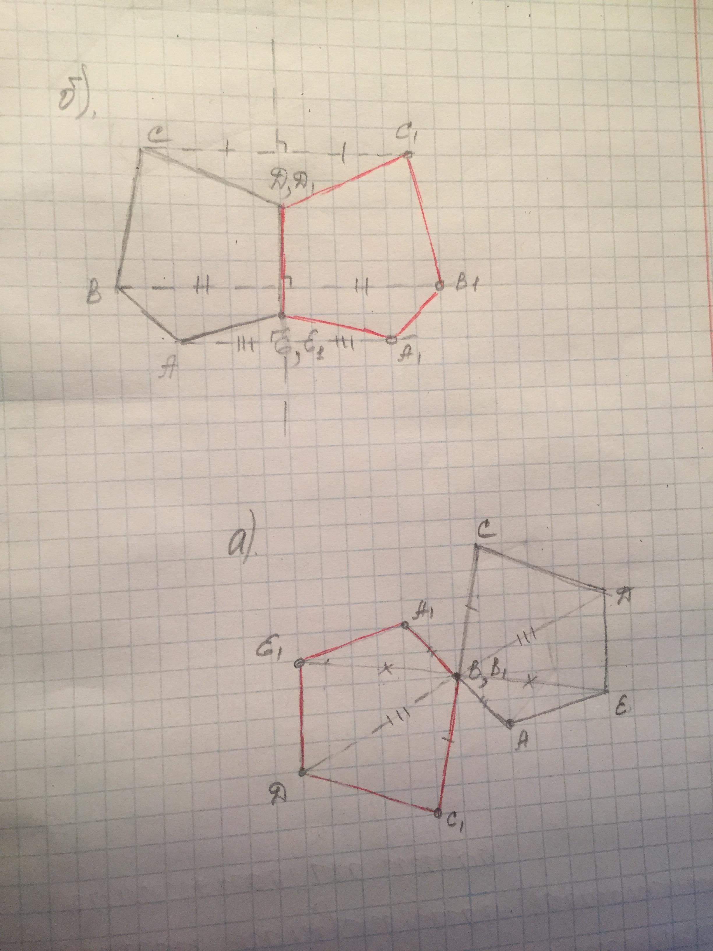 Дан пятиугольник АBCDE. Построить симметричные ему пятиугольник: а) относительно точки В б) относительно DE