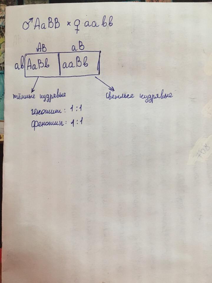 Какое возможно расщепление по генотипу и фенотипу у детей от женщины со светлыми прямыми волосами и мужчины с тёмными кудрявыми волосами, гетерозиготного по первому признаку?