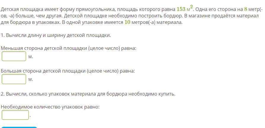 площадь равна произведению смежных сторон. пусть меньшая сторона будет равна х, тогда большая будет равна 8+х. Значит: s=x(x+8), что равно 153м^2: