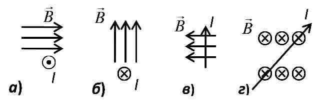 а) вверх, б) вправо, в) на нас, г) по диагонали, справа- снизу влево-вверх (наперекрест с током I)