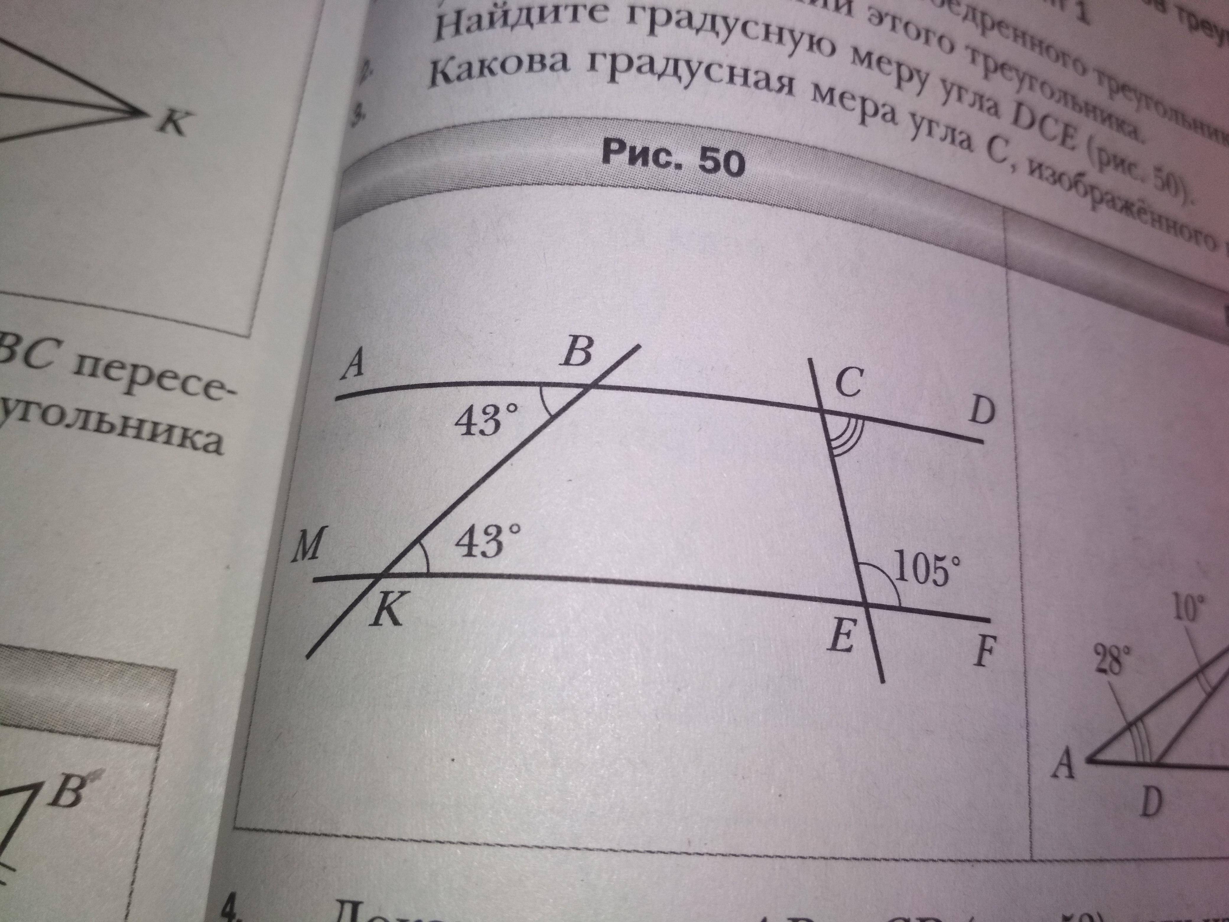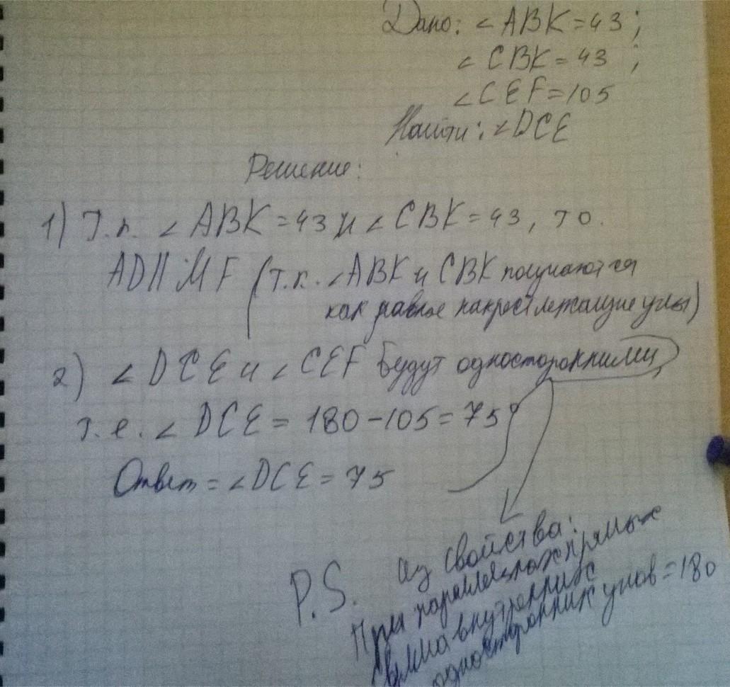 Т .к. сумма внут.углов равна180 ° , то <DCE= 180°- <CEF = 180°- 105°= 75°