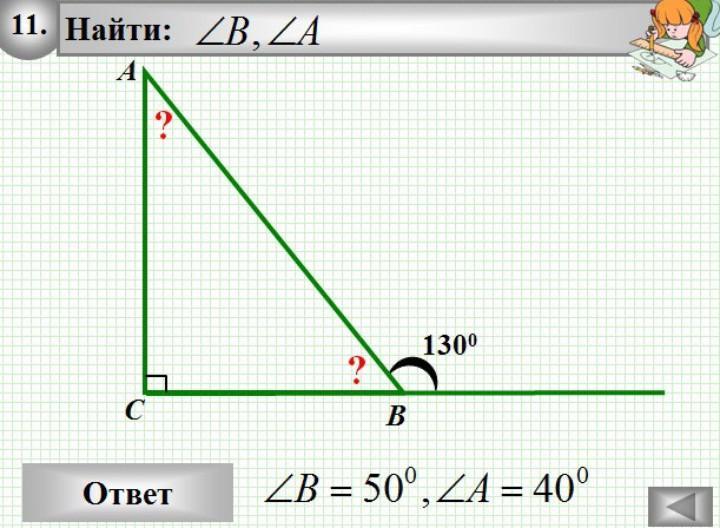 угол ABDи угол B смежные, а значит угол B = 180-130= 50°. Угол C равен 90°. Угол A = 130° - 50°= 80°