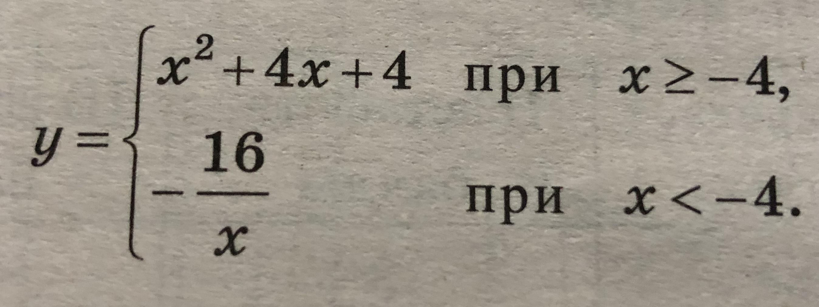 Вторая функция это гипербола у которой асимптоты x=0 y=0, она лежит во 2 и 4 четверти относительно своих координат и не пересекает оси координат т.к. они же являются её асимптотами, найдём ординату границы области определения этой функции и ещё несколько точек, т.к. x< -4, то гипербола будет только во 2 четверти и меньше точек искать).