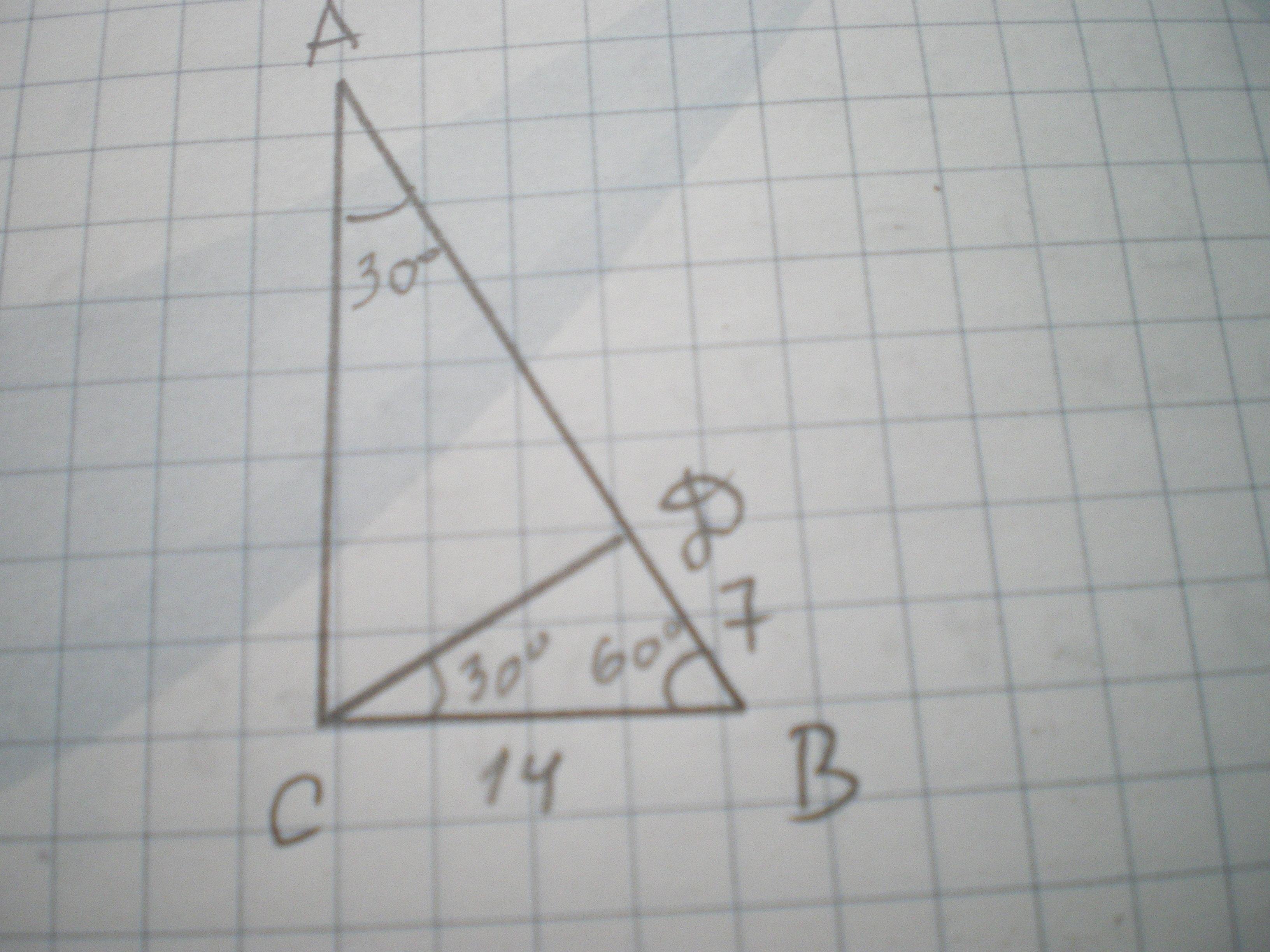 у трикутнику АВС відомо,що кут С=90градусів,кут А=30 градусів,СД-висота ВД=7см. знайдіть гіпотенузу АВ