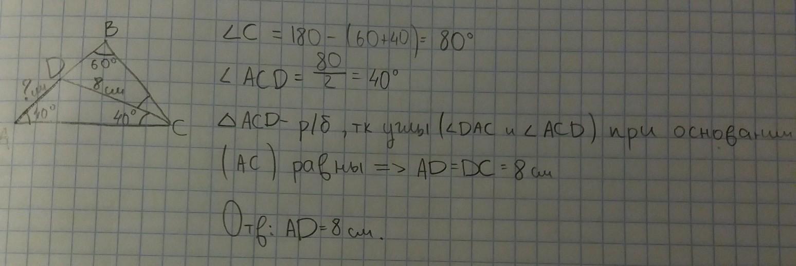 В треугольнике АВС проведена биссектриса CD=8 см ...