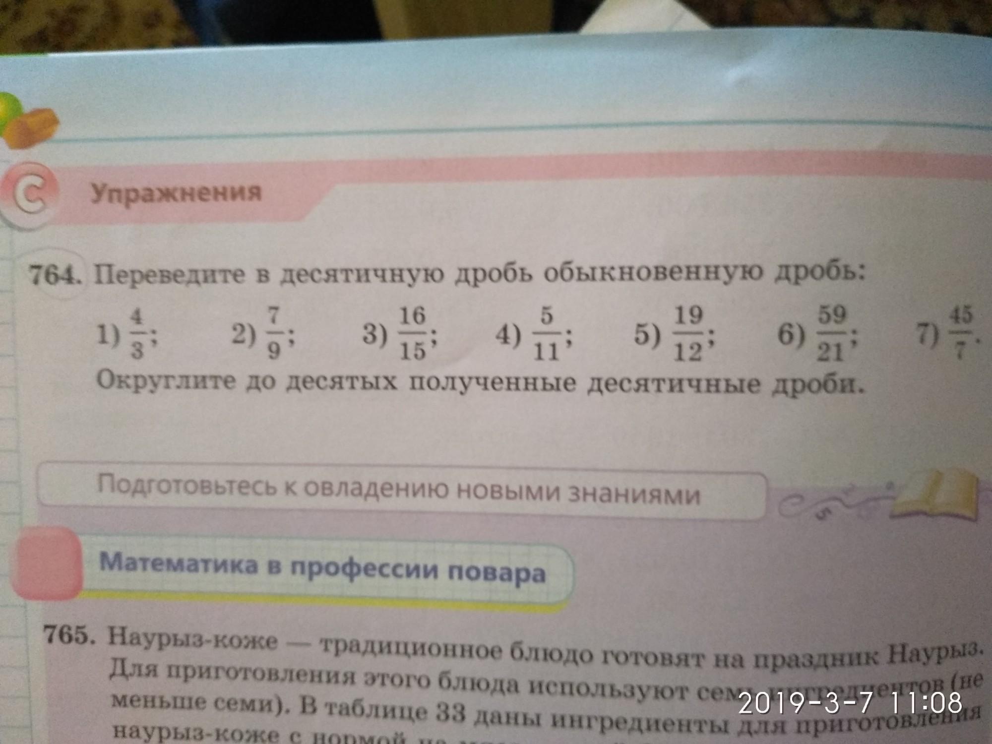 переведите обыкновенную дробь в десятичную дробь 4/2 7/9 16/15 5/11 19/21 45/7 ообьясните