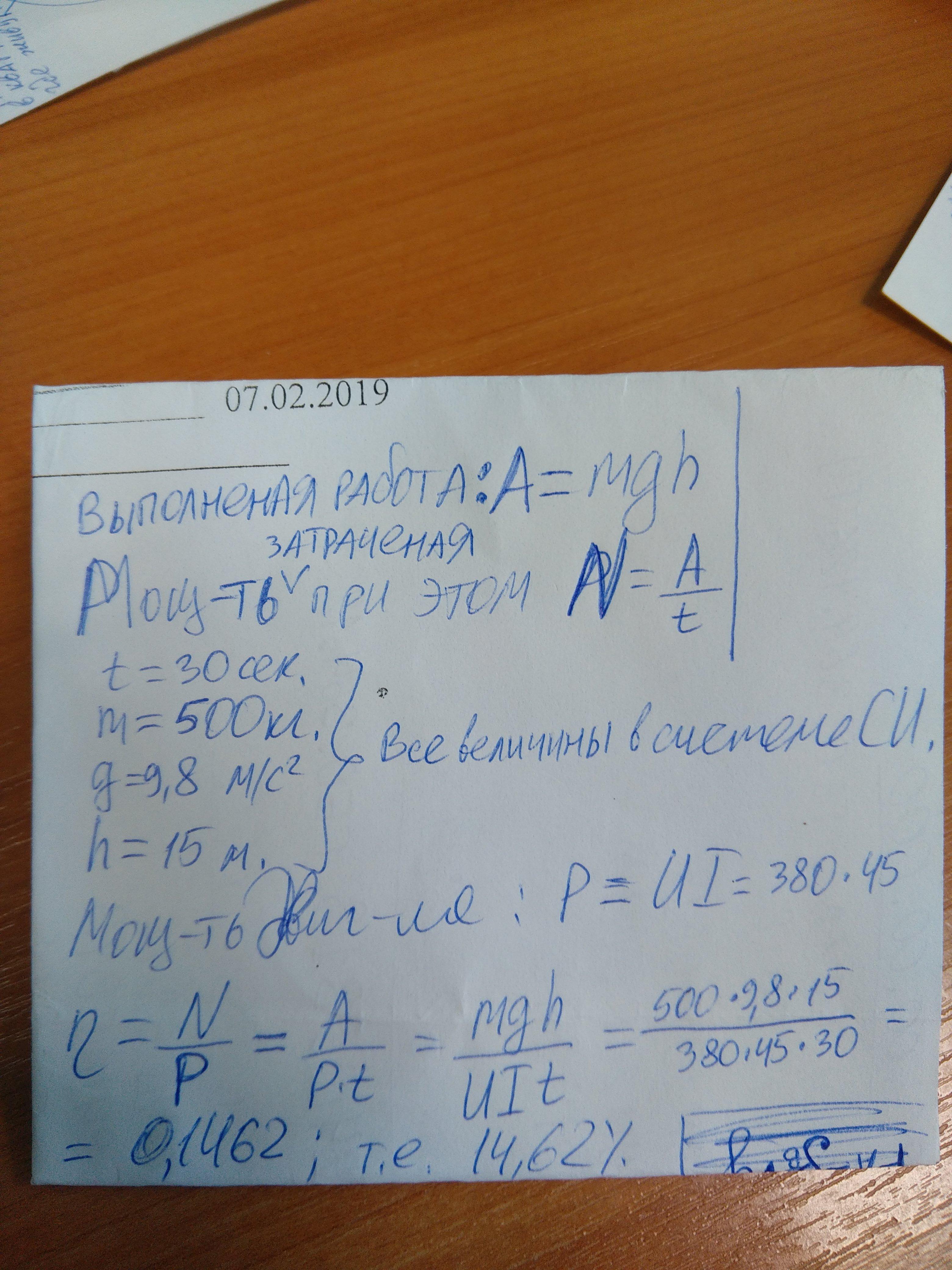 Транспортёр поднимает за время 0.5 мин груз массой 0.5т на высоту 15м сила тока протекающая через электродвигатель, транспортёра равна 45А если напряжение в сети 380В. Определите кпд