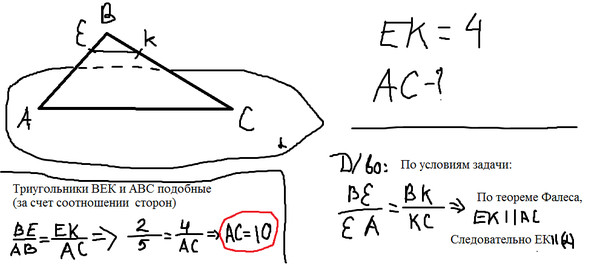 Дан треугольник ABC, E принадлежит AB, K принадлежит BC, BE : BA=BK : BC = 2:5. Через AC проходит плоскость альфа , не совподающая с плоскостью треугольника ABC . Доказать что EK паралелен альфе, найти длинну отрезка AC , если EK = 4 см