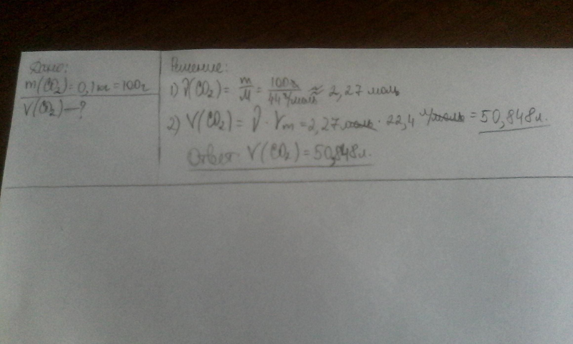 Масса углекислого газа CO2 равна 0,1 кг. Вычисли объём, который этот газ занимает при нормальных условиях