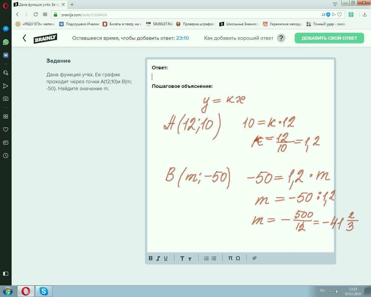 Дана функция у=kx. Ее график проходит через точки А(12;10)и В(m; -50). Найдите значение m.