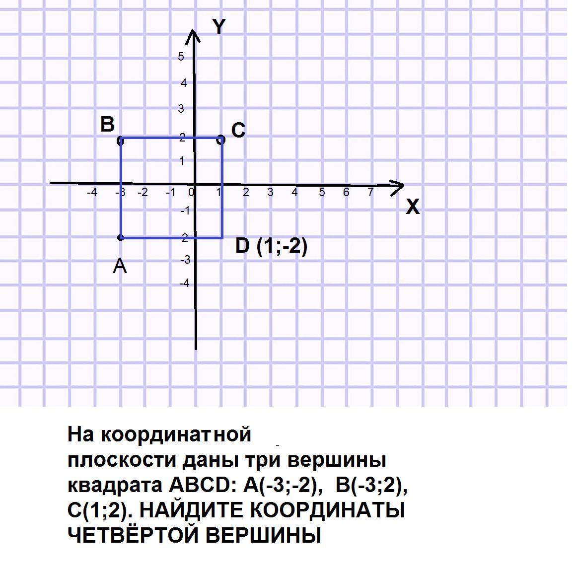 На координат ной прямой плоскости даны три вершины квадрата даны три вершины квадрата ABCD:A)(-3:-2 B) (-3:2) C(1:2)НАЙДИТЕ КООРДИНАТЫ ЧЕТВЁРТОЙ ШИРИНЫ
