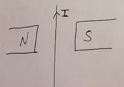 Магнитное поле направлено слева направо( от севера к югу). По правилу левой руки определяем, что сила Ампера направо за плоскость рисунка.