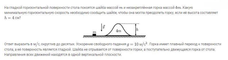 Шайба сможет преодолеть горку, если она в верхней точке будет иметь скорость v₁, равную скорости горки в этот момент (или большую).