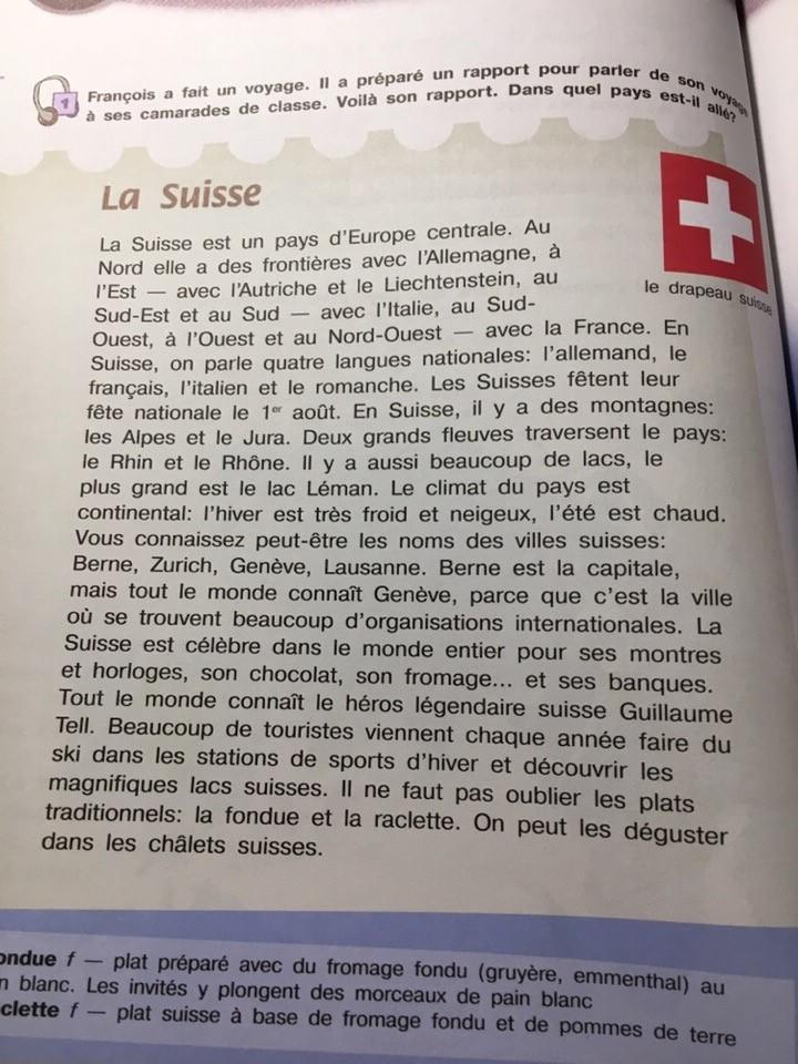 Швейцария страна Центральной Европы. На севере она граничит с Германией, на востоке с Лихтенштейном и Австрией. На юге и юго-востоке и юге с Италией. На юго-западе, западе и северо-западе с Францией. В Швейцарии 4 национальный языка: французский, немецкий, итальянский и романшский. Национальный праздник Швейцарии 1 августа. В Швейцарии горы, Альпы и Юра, две пересекают страну: Рин и Рон. Также много озер, самое большое из них это Леман. Климат страны умеренный: зима очень холодная и снежная, а лето теплое. Вы знаете некоторые города Швейцарии: Берн, Цюрих, Женеву, Лозанну. Столица это Берн, но весь мир знает Женеву, потому что этот город знаменит своими Интернациональными собраниями и встречами. Швейцария также известна в мире своими часами и их производством, шоколадом, сыром... и банками.