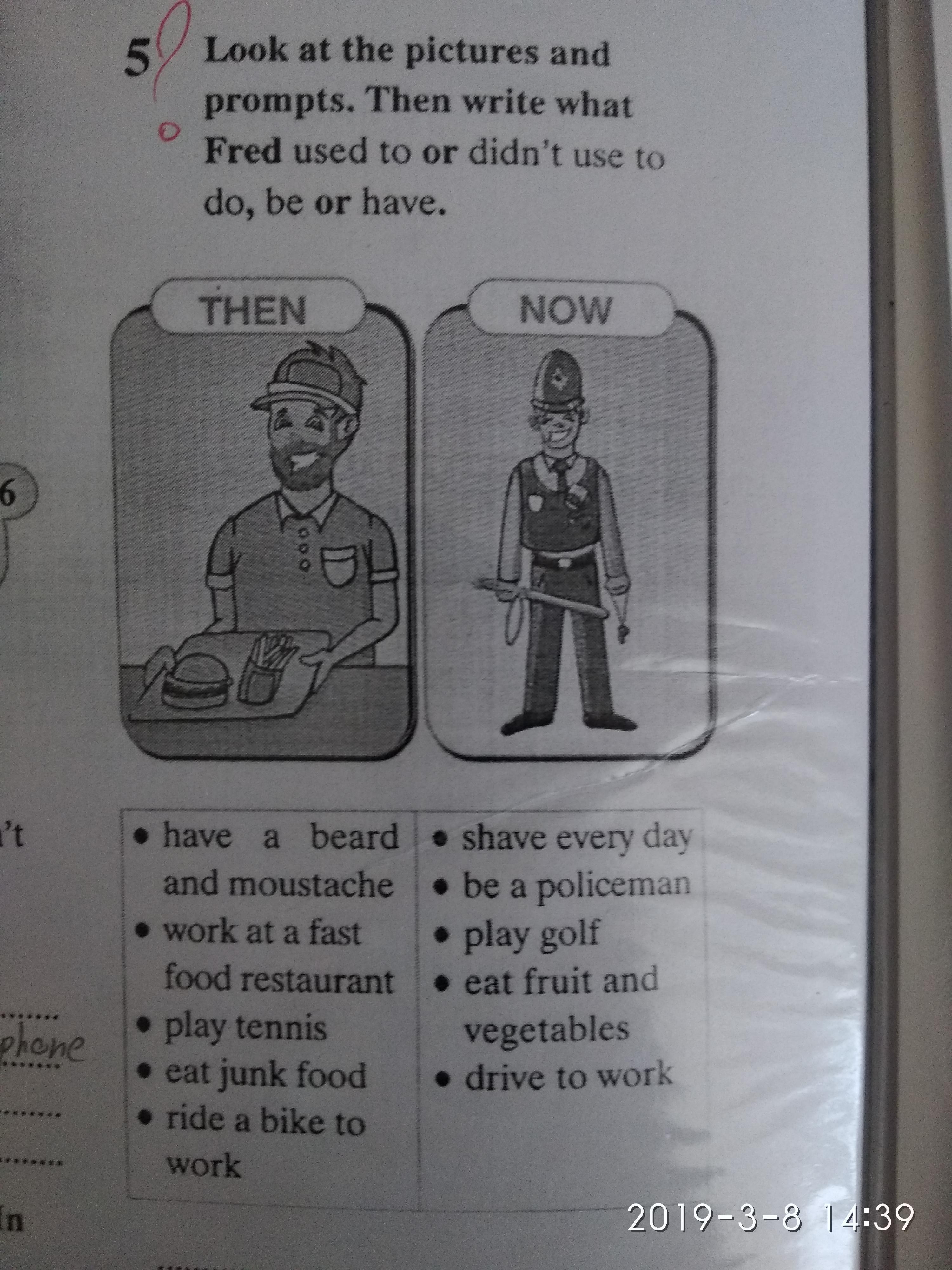 Then Fred used to work at fast food restaurant, have a bread and moustache and ride a bike to work, but he didn’t use to play tennis and eat junk food. Now Fred used to shave every day, be a policeman, and dive to work, but he didn’t use to play golf and eat fruit and vegetables.