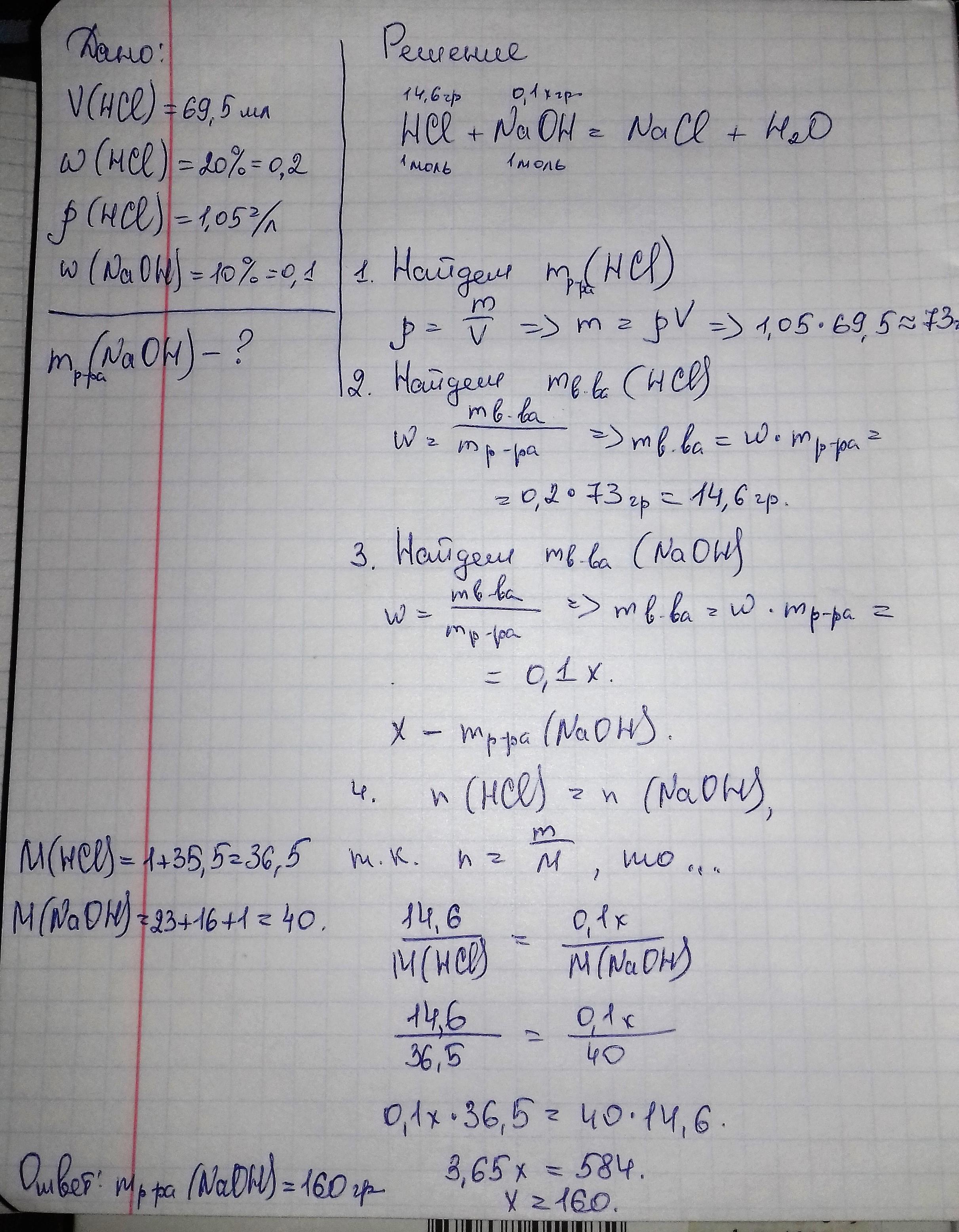 Для нейтрализации 69,5 мл 20% раствора соляной кислоты (p=1,05 г/мл) необходим 10% раствор гидроксида натрия массой(г)