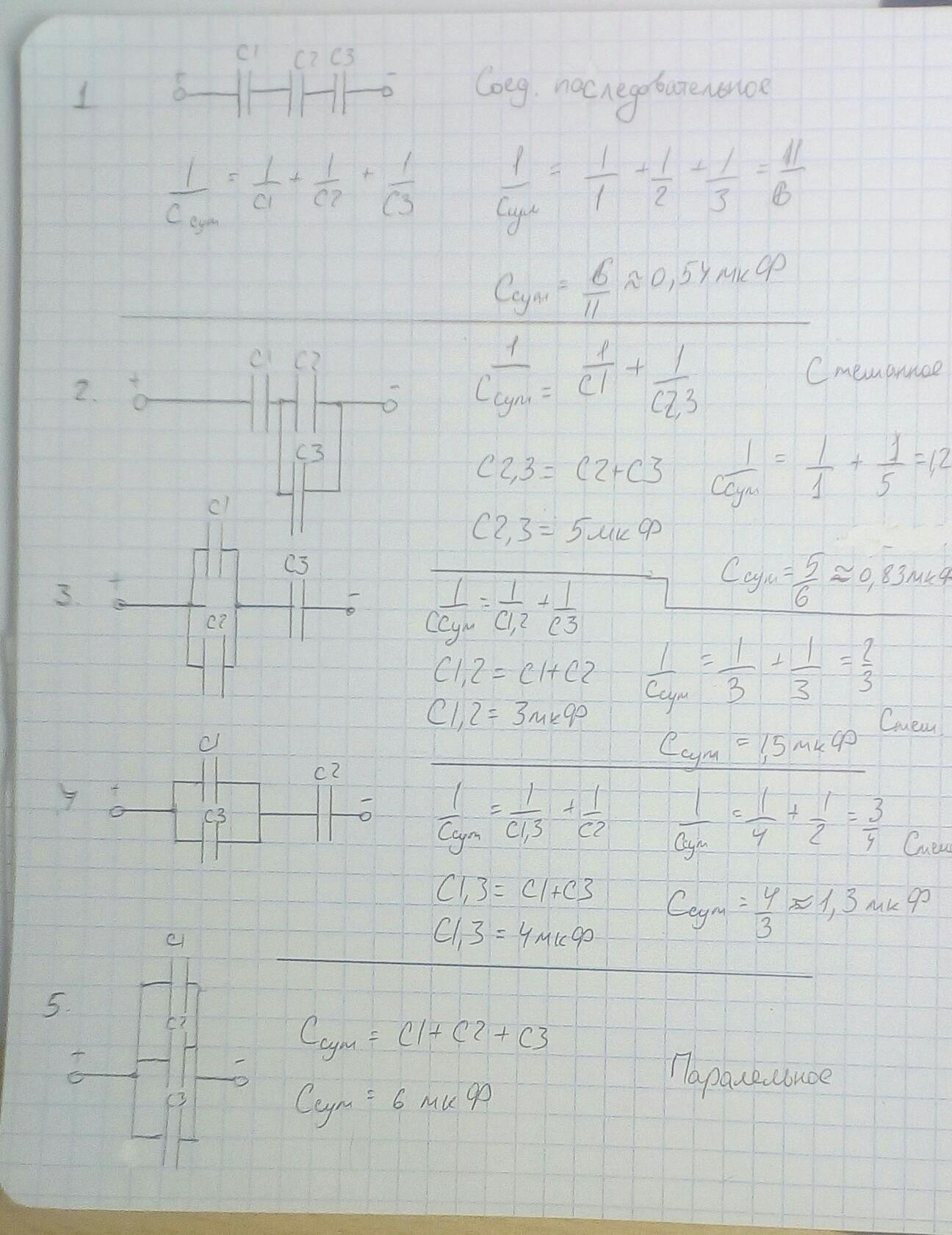 Найдите суммарные электроемкости цепи, используя 3 конденсатора c электроемкостью 1мкФ, 2 мкФ и 3 мкФ.