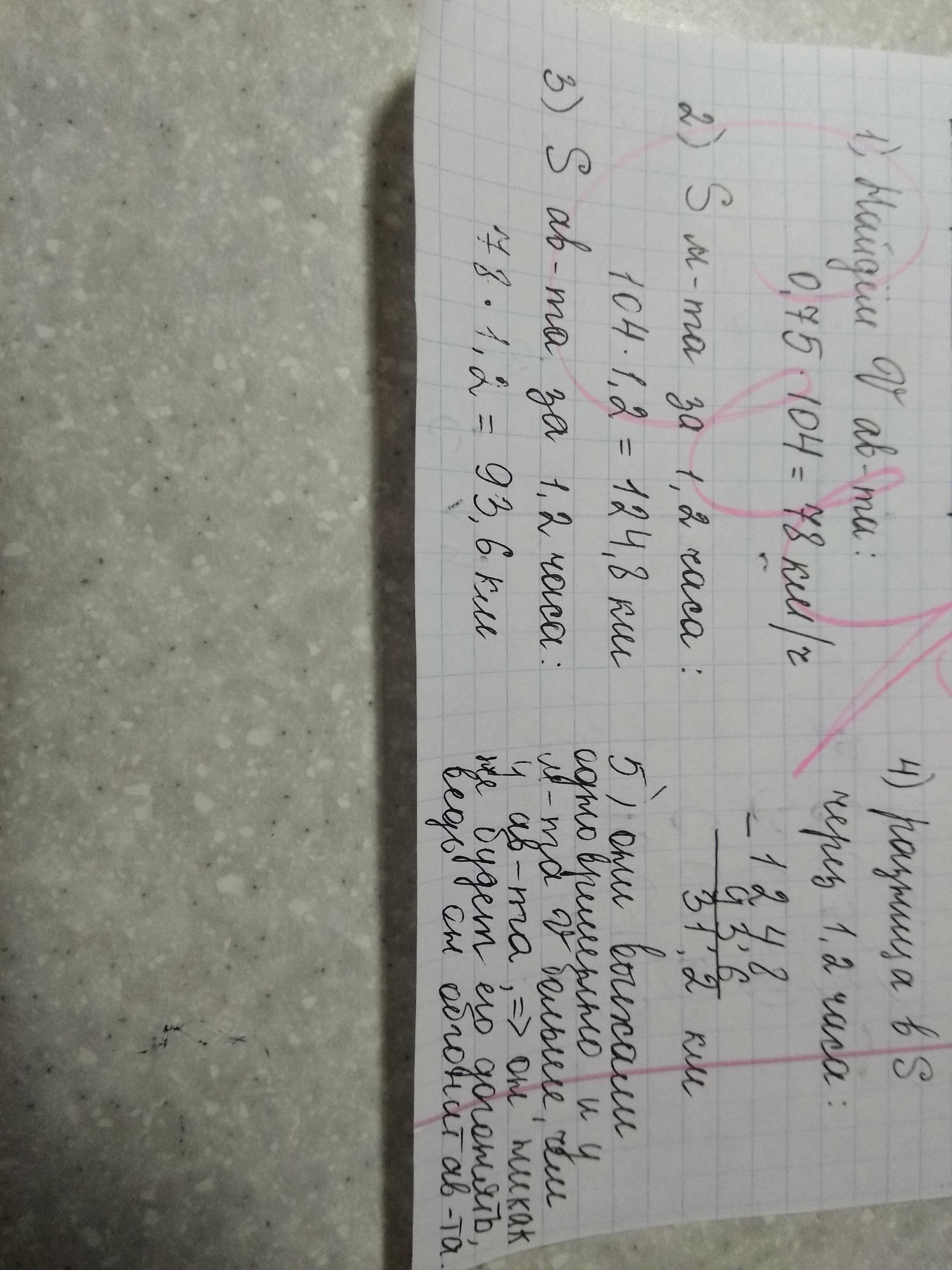 из двух городов расстояние между которыми 130 км одновременно в одном направлении выехали мотоциклист и автомобилист. Мотоциклист догоняет автомобилиста со скоростью 104 км/ч, а скорость автомобилиста состовляет 0,75 Скорости мотоциклиста. Какое расстояние будет между ними через 1,2 часа после начала движения? Через сколько времени мотоциклист догонит автомобилиста?