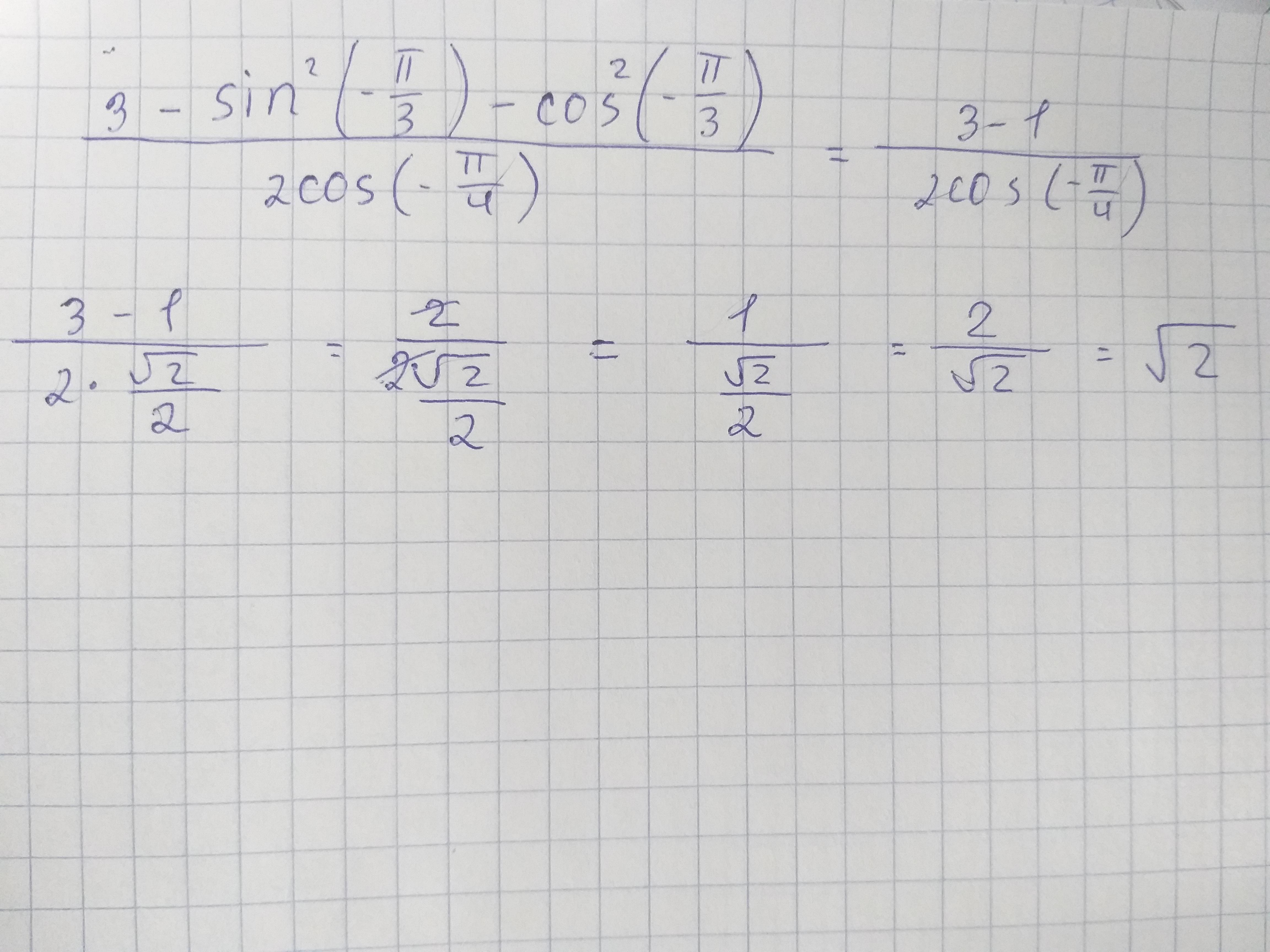 3-sin^2(-п/3)-cos^2(-п/3)/2cos(-п/4)