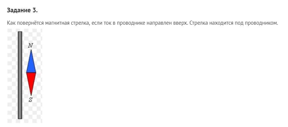 Север стрелки (N) повернется влево (против часовой стрелки) на 90°. По правилу правой руки: если большой палец правой руки будет направлен по направлению тока, то оставшиеся 4 пальца укажут направление магнитных линий, а магнитная стрелка поворачивается севером по направлению этих линий.