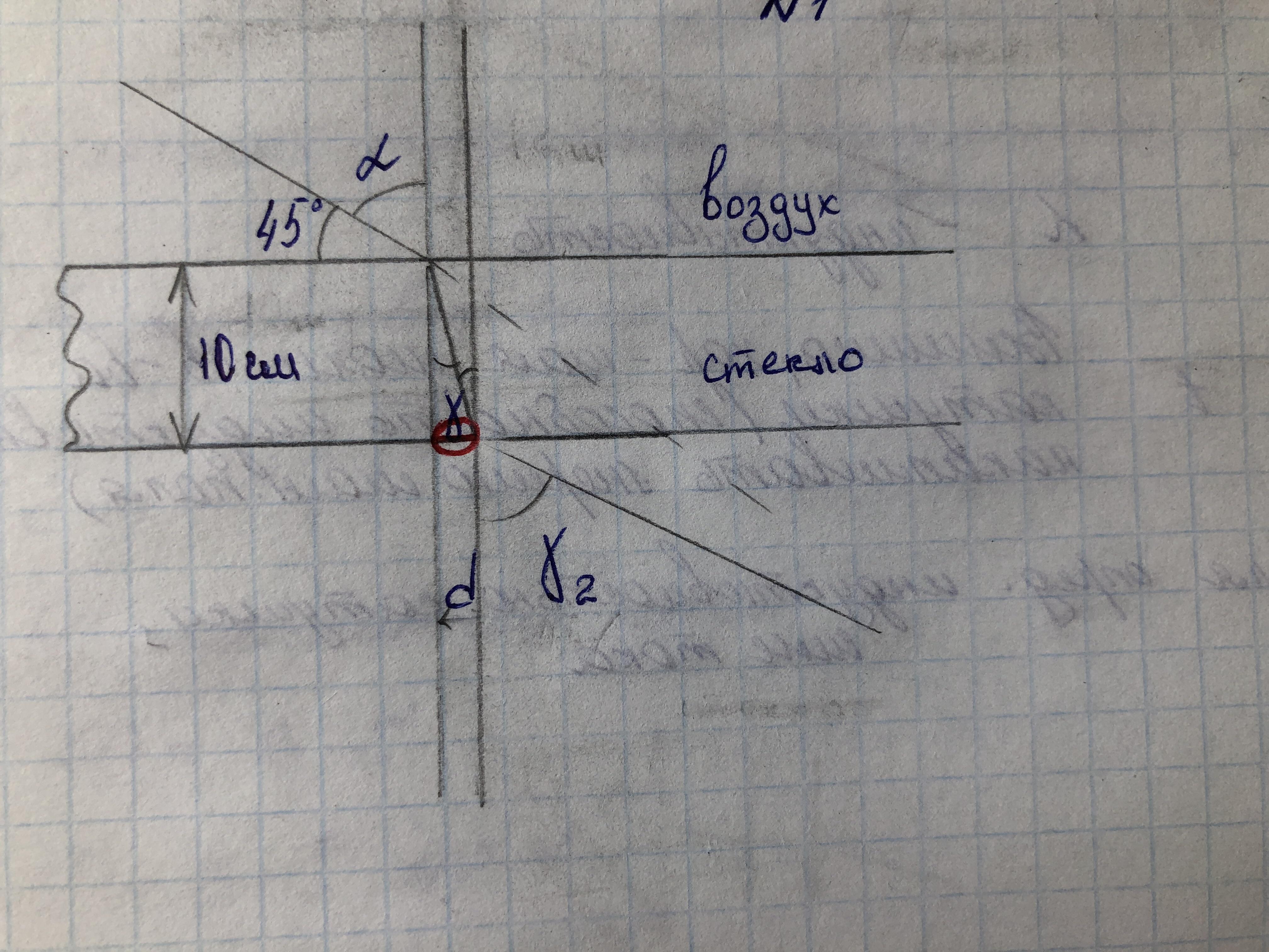 Пусть n=1,5 для стекла. sina/sinj=n sinj=sina/n=0,71/1,5=0,473 a=arcsin(0,473)=28 градусов d/h=tgj tg28=0,532 d=h*0,532=10*0,532=5,32 см