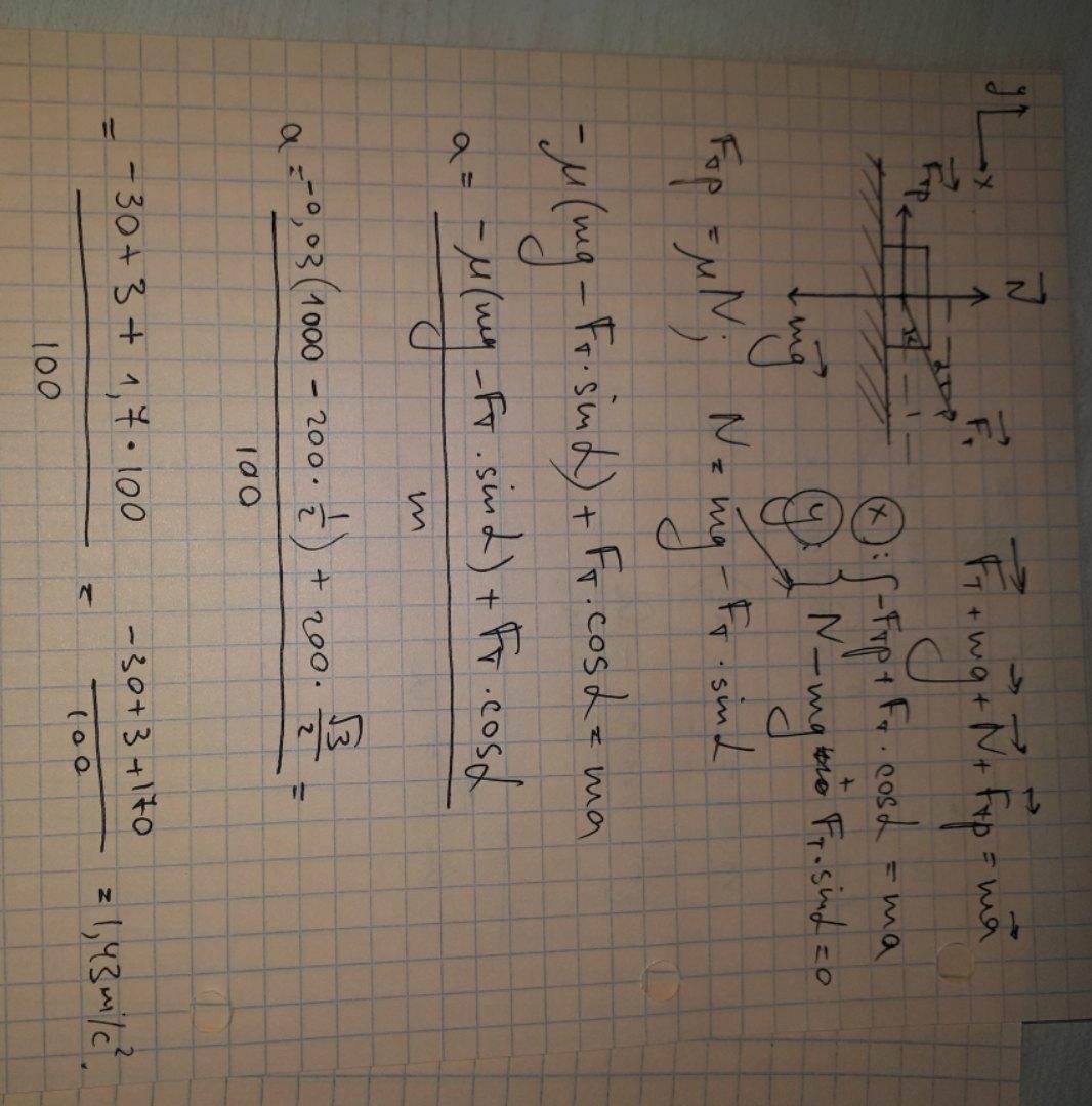 ящик массой 100кг тянут прикладывая силу 200 н направленную под углом 30 к горизонту коэффициент трения ящика о пол 0,03 с каким ускорением движеться ящик ?