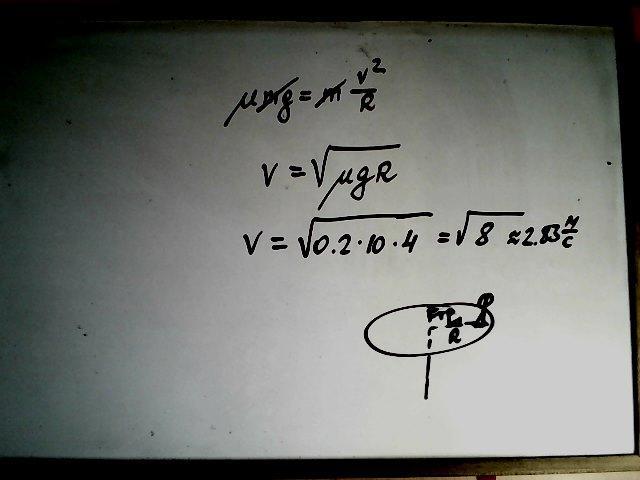 человек стоит неподвижно на краю круглой платформы, вращающейся вокруг вертикальной оси. определите модуль линейной скорости v(скорость) человека при вращении платформы, если ее радиус R=4м, а коэффициент трения u=0,20