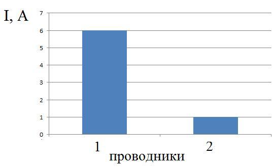 На рисунке изображена столбчатая диаграмма. На ней представлены значения силы тока в двух проводниках 1 и 2 одинакового сопротивления.