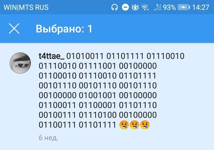 Данное сообщение было представлено в виде двоичного представления символов кодировки ASCII. Для его дешифровки требуется просто найти где-нибудь таблицу перевода данных символов из двоичного кода и начать дешифровывать. Второй вариант - просто воспользоваться каким-либо онлайн дешифратором.