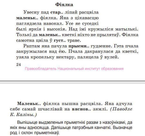 Старай(ж.р.,-ай,т.склон) липай, маленькая(ж.р.,-ая, н.склон)фиялка, маленькай(ж.р.,-ай, р.склон)кветки, у густой(ж.р.,-ой, м.склон) траве, прыемнае(н.р., -ае, в.склон)гудзенне, маленькая(ж.р.,-ая,н.склон)фиялка, на вясновай(ж.р.,-ай,м.склон)зямли