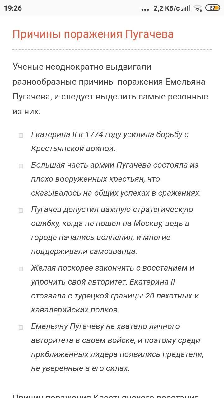 главной причиной того что в начале 1774 года Пугачев начал терпеть поражение, стало укрепление позиций императорских войск. Екатерина 2 наконец почувствовала опасность этого восстания поэтому отправила на подавление движения части Голицына, Мансура и Муфели . Узнав о том что в их сторону движутся новые войска, Пугачев отвел своих людей от Оренбурга . Фактически сняв осаду и приняв здесь первое поражение!!!!!