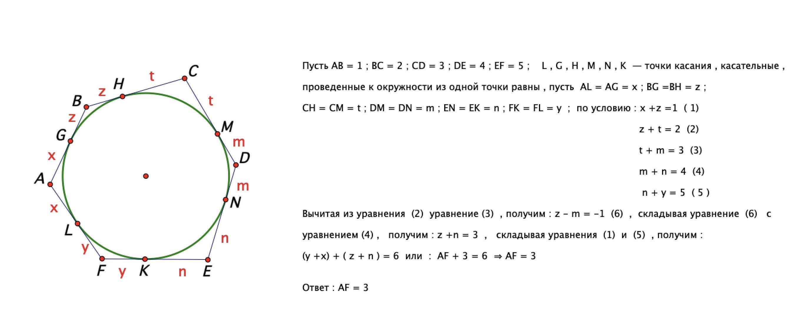 Около окружности описан выпуклый шестиугольник, длины последовательных пяти его сторон равны 1, 2, 3, 4 и 5. Чему равна шестая сторона?