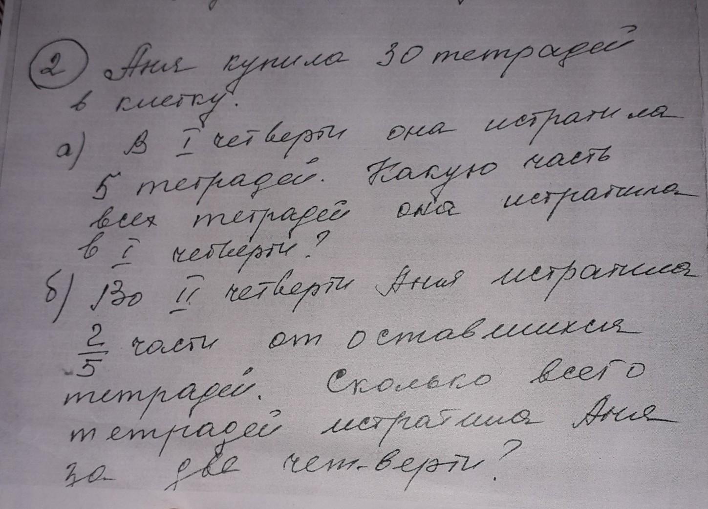 Б)25 у нее осталось на вторую четверть, значит 25×2/5=10 истратила во вторую четверть. 5+10=15 тетрадей за обе четверти