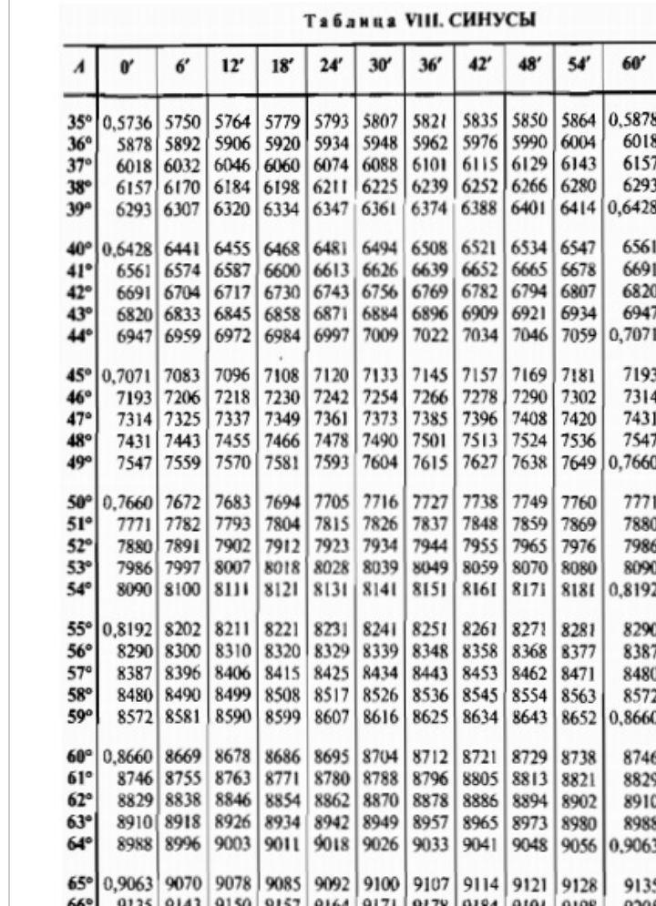 Используем таблицу Брадиса (В данном случае будем искать Синус 35°, так как Косинус и Тангенс можно будет найти по формуле)