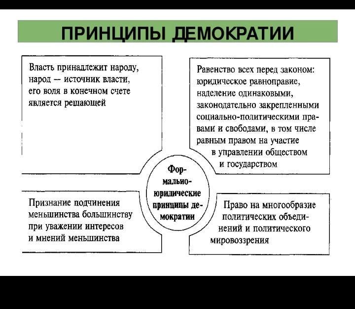 Принципы демократии универсальны для открытых, цивилизованных обществ. В том смысле, что в совокупности в их органической взаимосвязи они составляют основу самоопределения людей, каждого человека и гражданина, развития его социально-политической активности; принципы образуют фундамент разрешения противоречий между интересами членов сообщества, гармонизации частных и групповых интересов с общими интересами