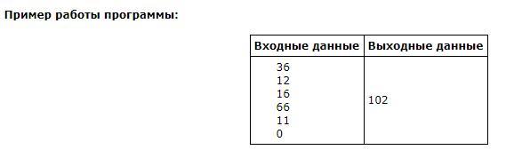 Напишите программу, которая в последовательности натуральных чисел определяет сумму всех чисел, кратных 6 и оканчивающихся на 6. Программа получает на вход натуральные числа, количество введённых чисел неизвестно, последовательность чисел заканчивается числом 0 (0 – признак окончания ввода, не входит в последовательность). Количество чисел не превышает 100. Введённые числа не превышают 300. Программа должна вывести одно число: сумму всех чисел, кратных 6 и оканчивающихся на 6.