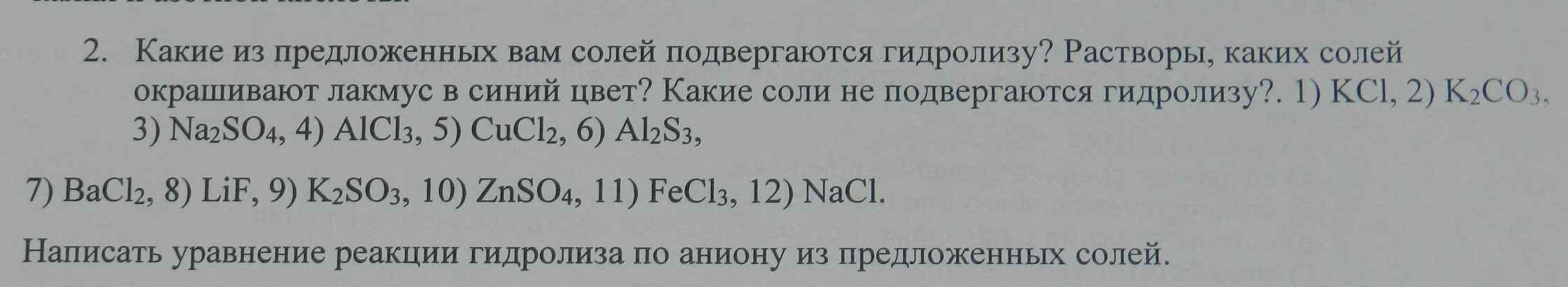 Какие из предложенных вам солей подвергаются гидролизу? Растворы, каких солей окрашивают лакмус в синий цвет? Какие соли не подвергаются гидролизу?. 1) KCl, 2) K2CO3, 3) Na2SO4, 4) AlCl3, 5) CuCl2, 6) Al2S3,